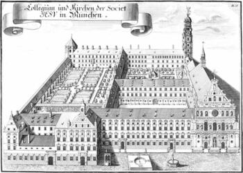 Bildnachweis: Kupferstich des Jesuitenkollegs und der Kirche St. Michael (Wilhelminum) von Michael Wening in der Topographia Bavariae, etwa um 1700.